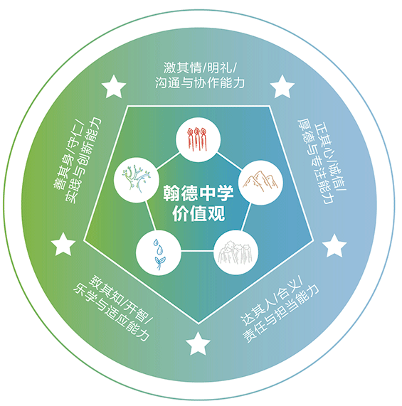 益田翰德学校中学部秉承“正其心、致其知、翰立世间,善其身、达其人、德行天下!”的核心价值观,建构我们的学生观与教师观、课程体系和评价体系。