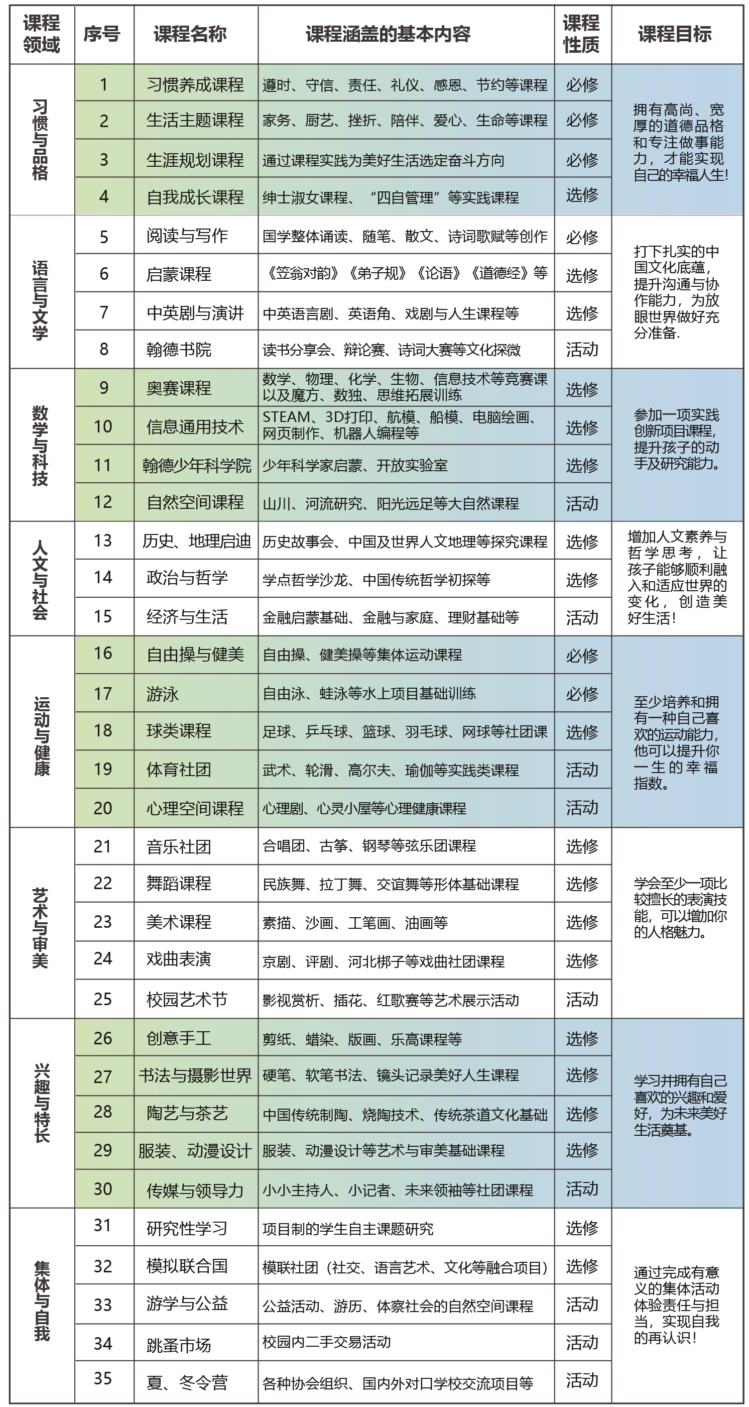 中学在开齐开足国家课程外,对接小学部继续深入实施“核心校本课程体系”。着重培养学生未来美好生活所需的基本素养。从习惯与品格、语言与文学、数学与科技、人文与社会、运动与健康、艺术与审美、兴趣与特长、集体与自我八大领域,培养学生“实践与创新、沟通与协作、厚德与专注、责任与担当、乐学与适应”等五种关键能力。