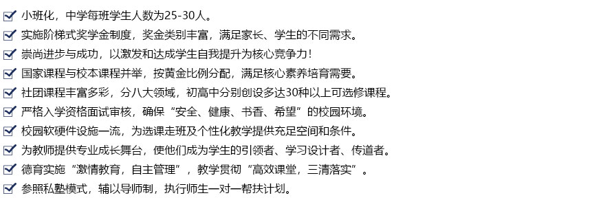 中学部根植于中华优秀传统文化,借鉴融合世界教育之优,致力于培养学生终身受益的良好习惯、掌握行之有效的学习方法、形成自主发展的创新能力。我们崇尚“进步就是成功,进步就是优秀”,实施“爱的教育,行的规矩”,为学生创设“安全、健康、书香、希望”的校园环境,学校提供丰富多彩的课程体系,帮助学生成长,鼓励学生进步,唤醒学生梦想,最终实现启迪智慧、涵养品性、激活动力,觉醒生命!